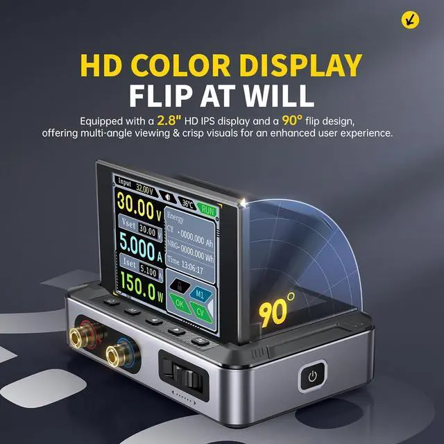HD Color Screen, Flippable at Will: Featuring a 2.8 inch HD IPS color screen with a 90 degree flip design, providing multi angle visibility and crisp display for an enhanced user experience. Real time monitoring of voltage, current, and power parameters.