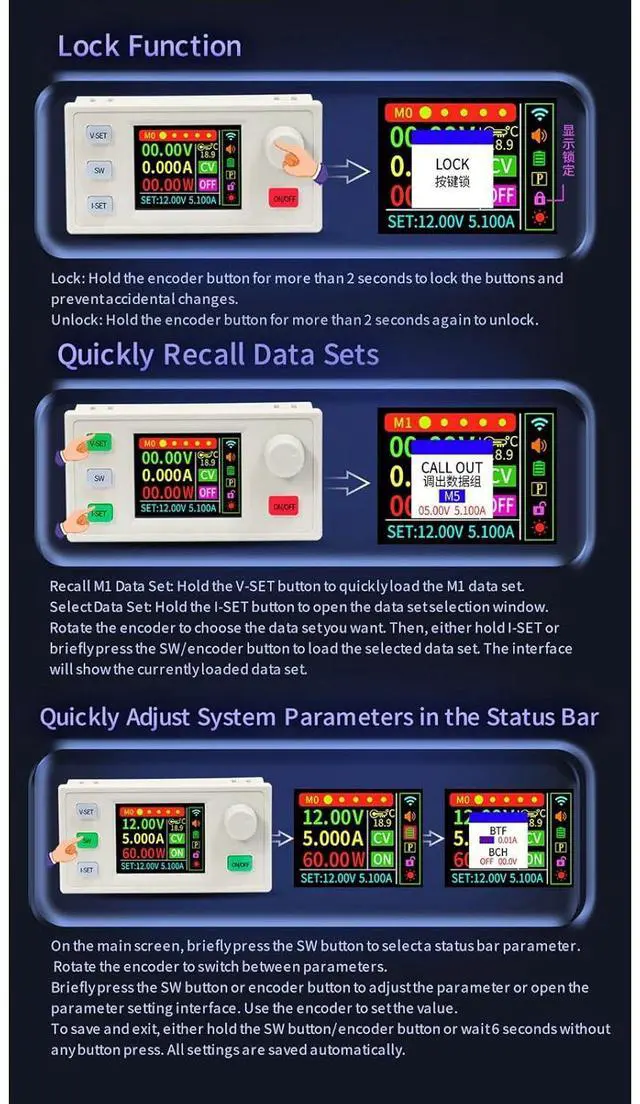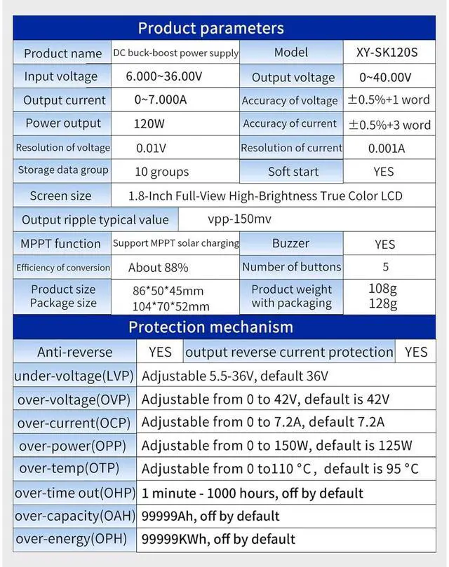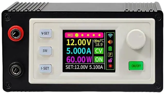 Features 6 36V input ranges, 0 36V adjustable output, 88% efficiency, 10 memory presets, and multiple protections for safe, stable power regulation