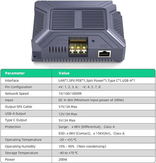 The power adapter delivers 200W output with a 5 in 1 conversion kits, ensuring uninterrupted power supply and Gigabit speed connection for satellite dishes