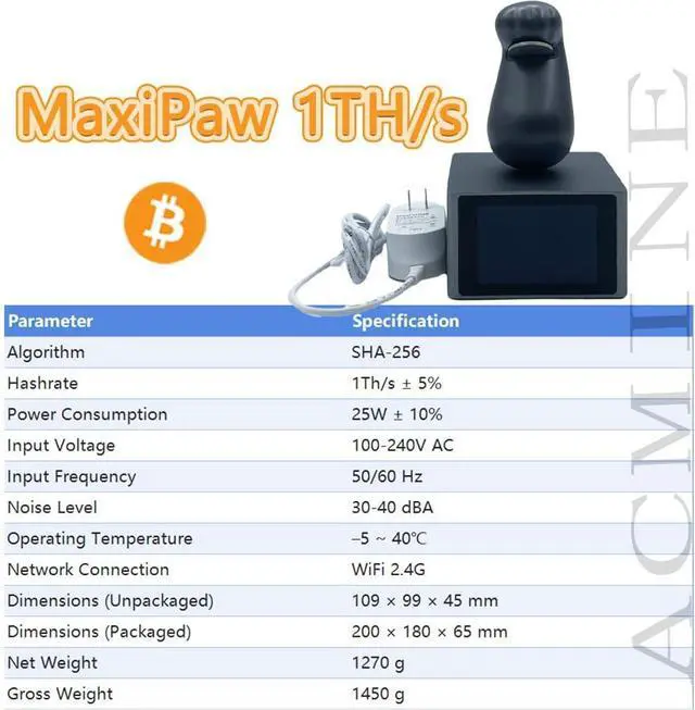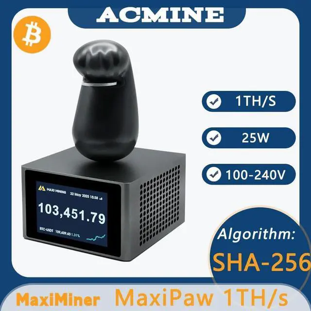 The MaxiPaw Bitcoin Miner delivers efficient 1TH/s mining performance with only 25W power consumption, making it one of the most energy-efficient solutions for home and office use. Its advanced ASIC technology ensures stable Bitcoin mining operations while the real-time price monitor displays current profitability metrics and market trends directly on the sleek, compact device