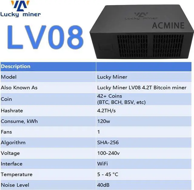 The Lucky Miner LV08 delivers powerful 4.2TH/s hash rate performance through its advanced SHA-256 ASIC technology and cutting-edge BM1366 chip architecture, optimized for efficient mining of Bitcoin (BTC), Bitcoin Cash (BCH), and Bitcoin SV (BSV) with support for 42 total cryptocurrencies