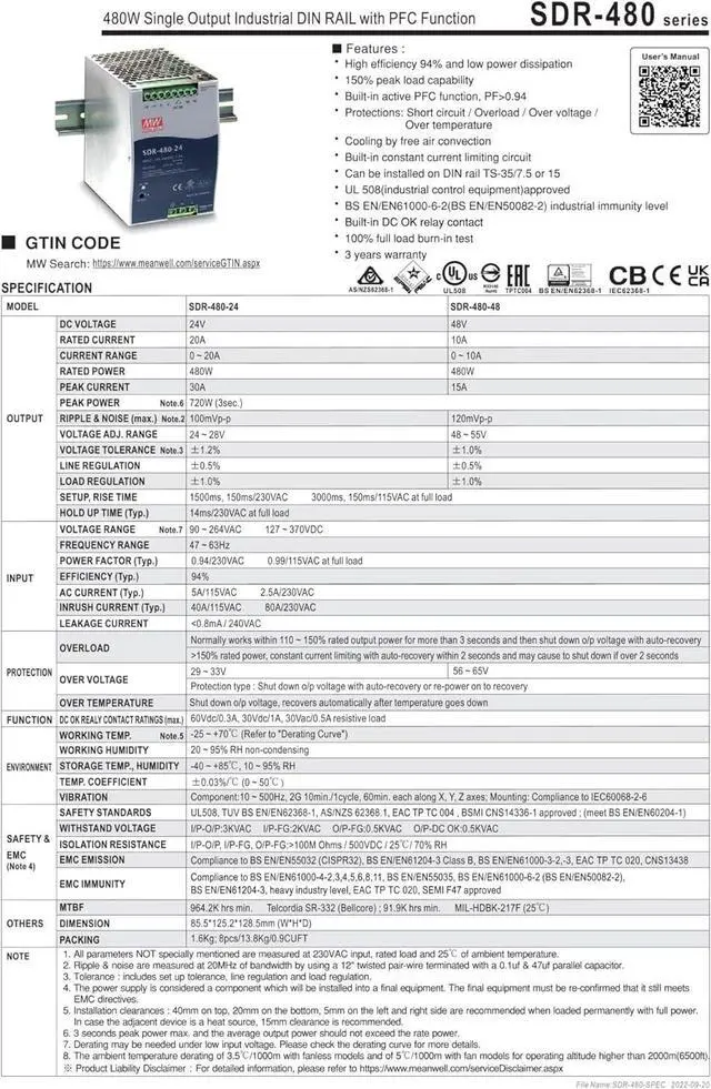 SDR-480 SDR-480-24 SDR-480-48 480W Single Output Industrial DIN Rail with PFC Function(SDR-480-48)