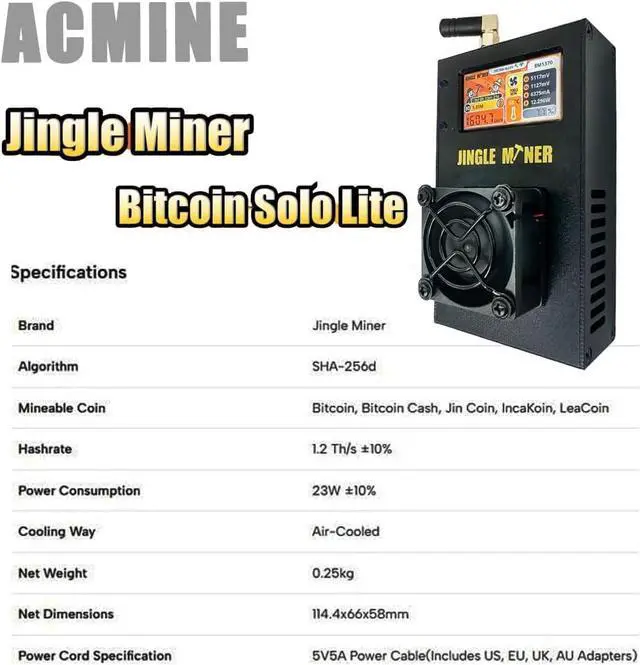 The Jingle Miner BTC Solo Lite redefines efficient cryptocurrency mining with its groundbreaking 19.17J/Gh energy efficiency. Designed for serious miners who demand both performance and sustainability, this professional-grade ASIC miner delivers 1.2TH/s of SHA-256 hashing power while consuming just 23W - making it the perfect solution for profitable Bitcoin mining in any environment.