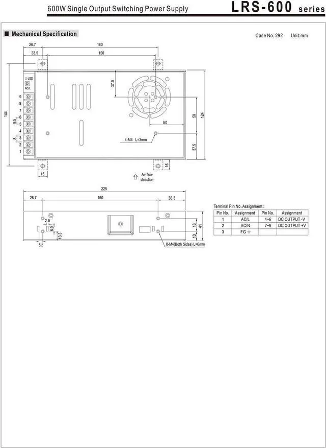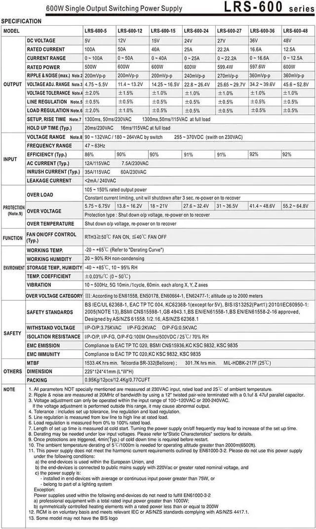 LRS-600 series is a 600W single-output enclosed type power supply with 41mm of low profile design. Adoptingthe input of 115VAC or 230VAC (select by switch), the entire series provides an output voltage line of 5V,12V,15V,24V,27V,36V and 48V.In addition to the high efficiency up to 92%, with the built-in long lifefan LRS-600 can work under -20~+65 with full load.LRS-600 has the complete protection functionsand 5G anti-vibration capability; lt is complied with complete international safety regulations.LRS-600series serves as a high price-to-performance power supply solution for various industrial applications.
