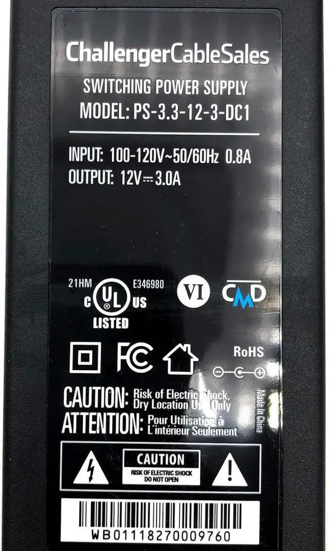 Challenger Cable Sales PS-3.3-12-3-DC1 12V 3A 36W Switching Power Supply AC/DC Adapter