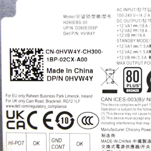 For 3710 3910 T3660 XPS 8950 7000 5000 260W Power Supply 0HVW4Y HVW4Y 0NCM9 HVW4Y 5FK7C 7JGJF L260EBS-00 H260EBS-00