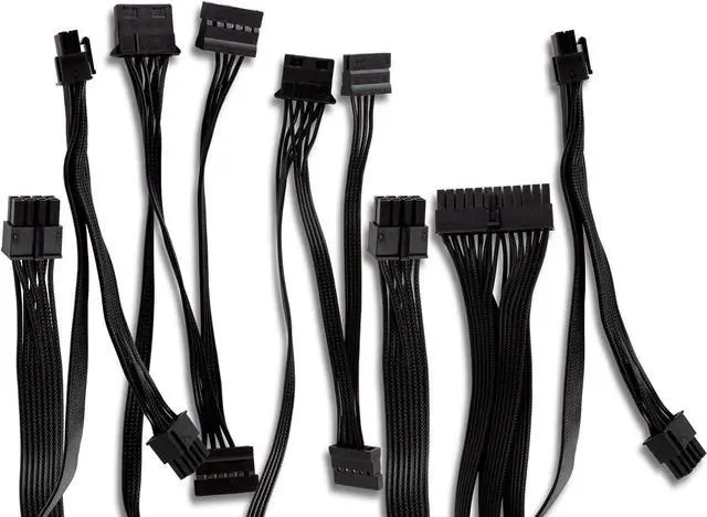 Extra Long Flat Cables Includes 1x ATX MB 20+4-pin, 1x EPS +12V 4+4-pin, 2x PCI-E 6+2-pin, 4x SATA, 2x Molex 4-pin, which facilitate assembly and improve airflow inside the enclosure.