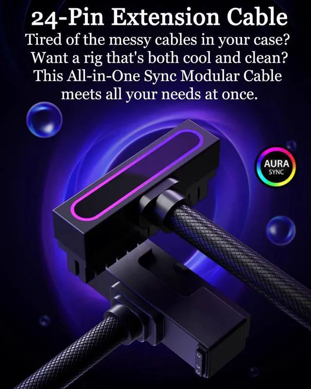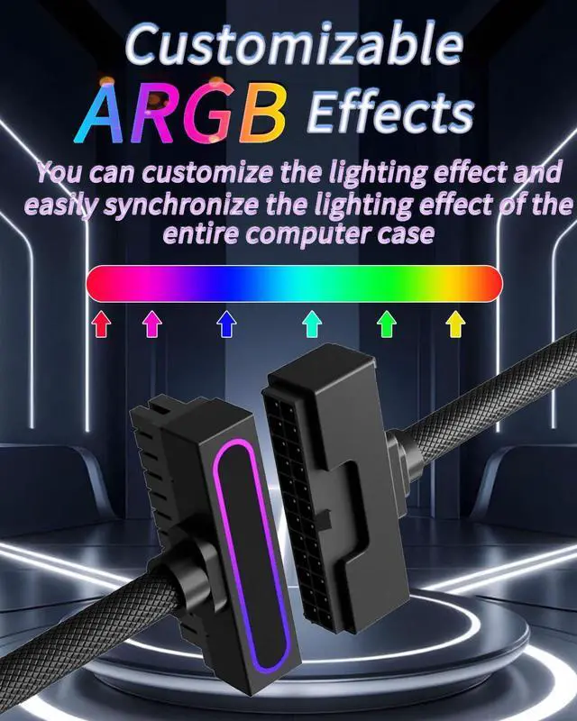 30CM 24PIN PSU Extension Cable, ARGB PC Cable with 5V 3Pin, 18AWG 90 Degree Right-Angle for Power Cable Extension, Male-to-Female Connectors for PC Power Cord(Black, 1Pack)