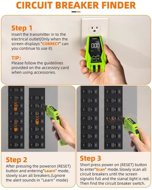 Expert in full scenario circuit diagnosis: Integrated circuit breaker finder tool+outlet tester+GFCI detection with three major functions, quickly identifying the correct breaker voltage anomalies (90-135V) wiring conditions , equipped with dual LCD screens to synchronously display real-time voltage and signal strength, solving complex circuit problems in home/commercial places.