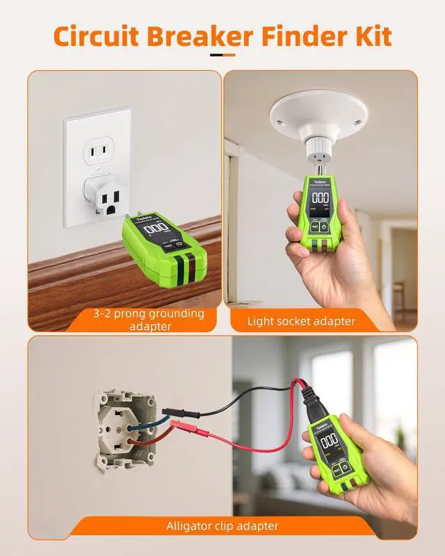 5-in-1 Professional Adaptation Set: It includes a lamp socket adapter (for testing lamp circuits), 3-prong to 2-prong grounding adapter, and an alligator clip (for bare wires only), which can be used in conjunction with a signal transmitter to achieve through-wall circuit tracing, covering 99% of circuit detection scenarios.
