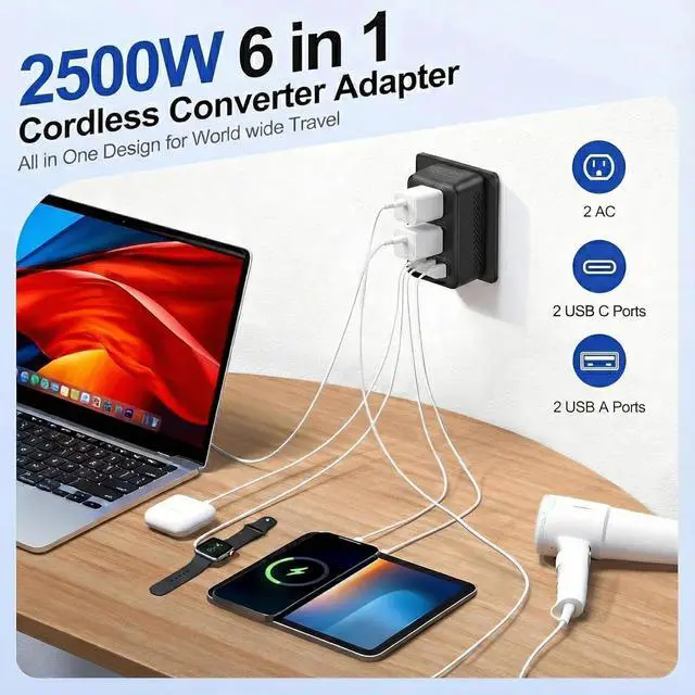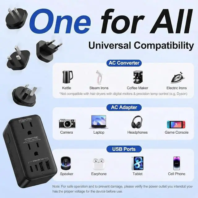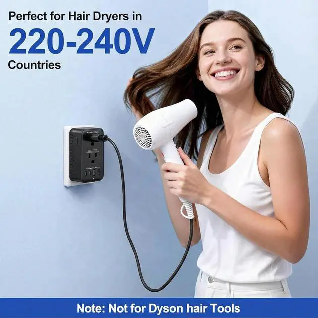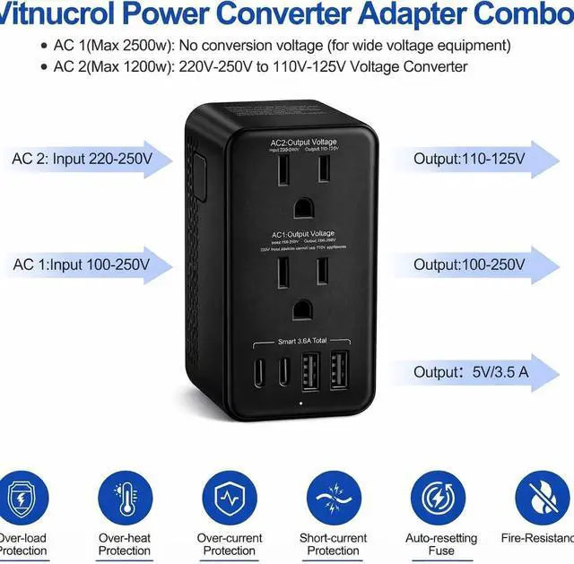 DUAL MODES FOR DIFFERENT DEVICES: Features two distinct sockets. AC1 Charger Socket: Strictly for multi-voltage devices with internal batteries (Laptops, Phones, Tablets). AC2 Converter Socket: Only for 110V/120V mechanical appliances (e.g., Mechanical Hair Dryers, Kettles). Warning: Do not plug devices with digital displays, touch screens, or electronic temperature controls into the AC2 socket.