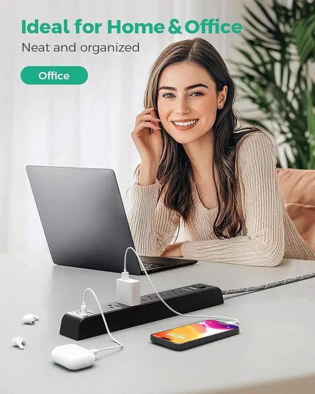 6AC outlets & 4 USB charging ports (5V/3.1A,15.5W), 12-foot heavy duty extension cord (1875W/15A). 900J surge protector with overload protection protects against spikes and fluctuations. Slim flat plug to allow the cord to fit closely to the wall. perfect for creating a power hub for your electronics at your home and office.