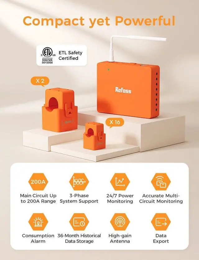 Power Supply100-240V~, 50/60HzChannels2 main circuits(Max.200A), 16 branch circuits(Max.60A)Invert Readings InstantlyEasily invert circuit readings without flipping the current transformer (requires app and firmware update)Bluetooth SetupYesAntennaA high-gain antenna can be positioned outside the switch-boardNetwork2.4G Only. Supports local LAN discovery of devices, does not support setting fixed ip for the time being.Operating Temperature0°C to 40°CSupported SystemSingle-phase, 2-wire systems, Single-split phase, 3-wire systems, 3-phase, 4-wire Wye systems with earthed (TN or TT) neutral (no-Delta)System RequirementSmartphone with iOS 13 or above or Android 8.0 or higher, Bluetooth 4.0 or laterSafetyETL Certified, FCC, IC, CPF EM16 New Features, Smarter Control Than Ever! Automate Zero Feed-In with Home Assistant Refoss EM16 Energy Monitor: Reliable, Accurate, Always Here for You. Technical Specifications