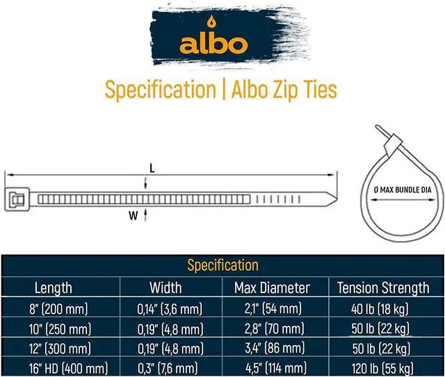 Optimal Size: Black 12 inch zip ties (300mm), 0.19 inches (4.8mm) in width, offer a robust solution for household fixes, handling up to 50 lb in tensile strength. Max bundle diameter: 3.4 inches (86mm).