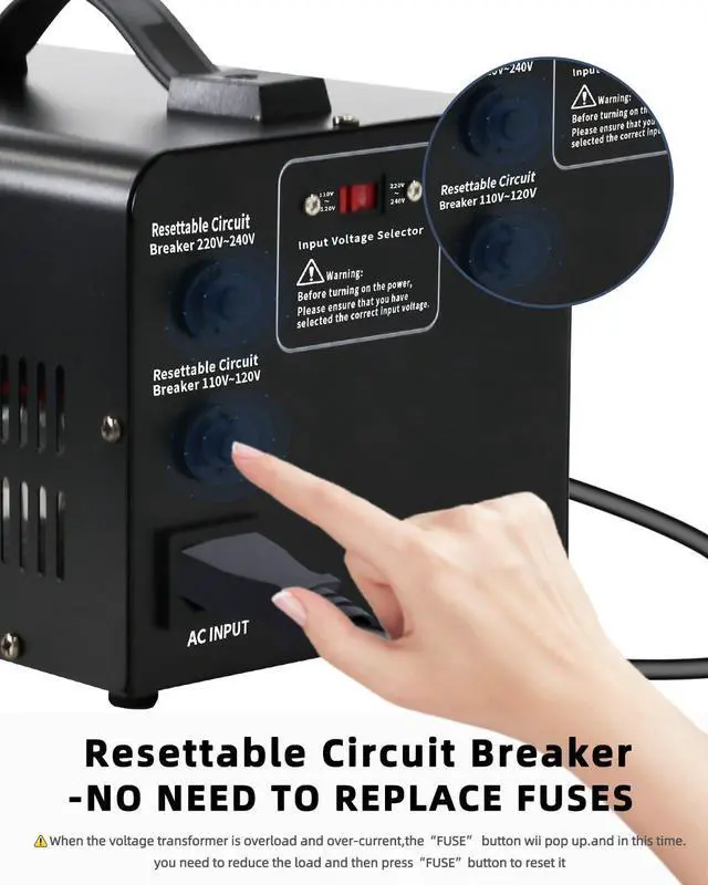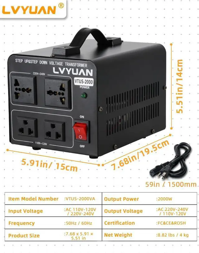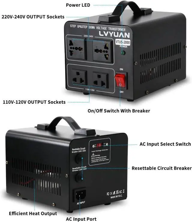 LVYUAN set up& down transformer has built-in fuse and Resettable Circuit Breaker to provide many protection measures, including overvoltage, undervoltage, overload, overtemperature and short circuit protection, always protect your equipment.