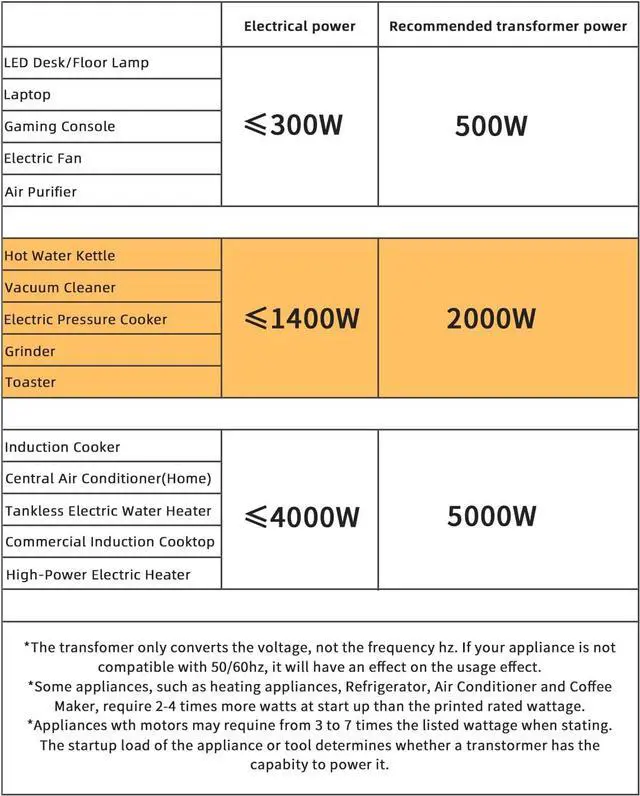 This depends on how many watts of power you are using in your appliances.Some appliances, such as heating appliances, power tools, coffee maker, laser printers, require 2-4 times more watts at start up than the printed rated wattage.