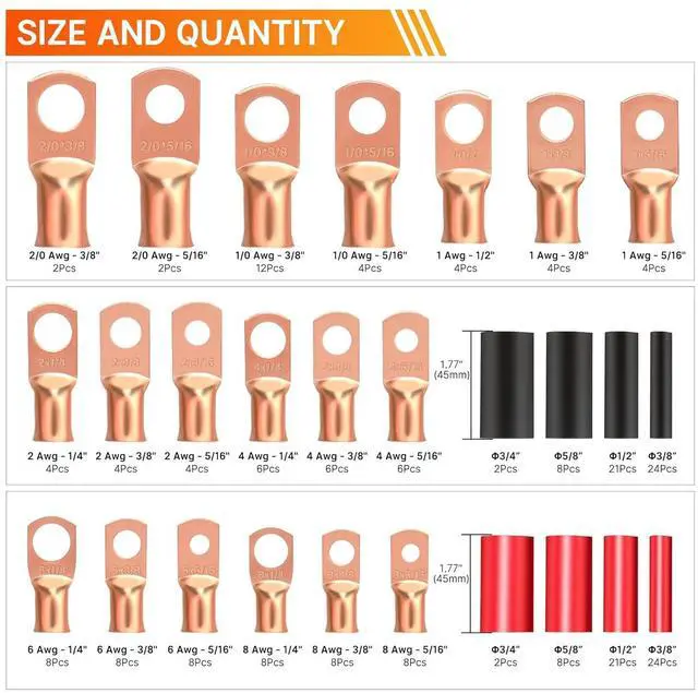 Comprehensive Kit: Includes copper wire lugs for AWG sizes 1/0 to 6 with bolt holes (1/4" to 1/2") and 3:1 heat shrink tubing, ensuring broad compatibility for wiring and installations.