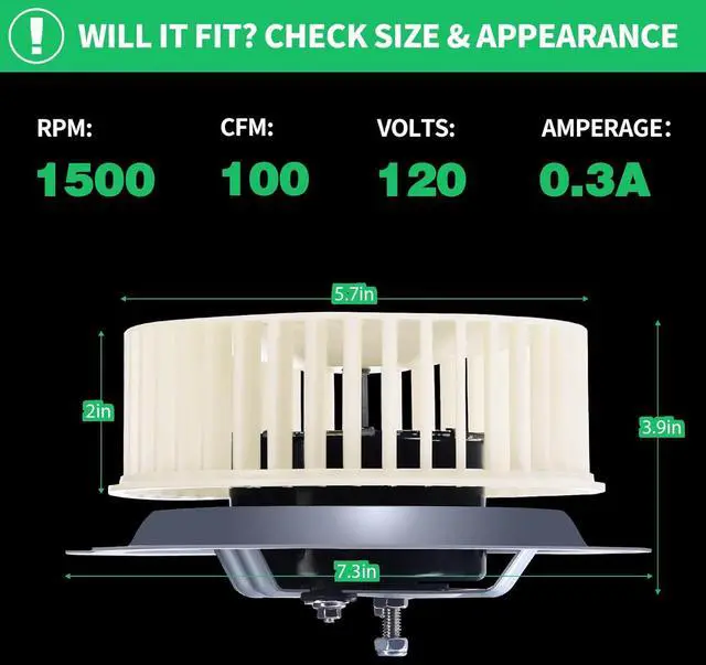 Will It Fit? Check Size & Style: Plate: 7.3", Impeller: 5.7", Motor Diameter 3.3", 3.0 Sones, 1500 RPM, CLASS B, Frequency: 60HZ, 2-prong plug.