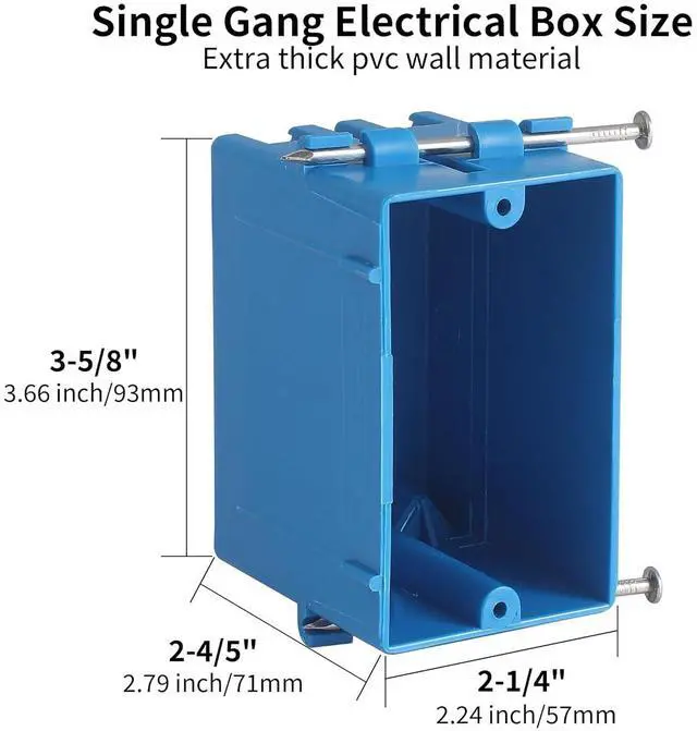 New Work Box 1 Gang Package Content: You will receive 10 pieces of single gang electrical outlet boxes at the size of 57x71x93mm / 2.24x2.79x3.66in. 18 cubic inches in capacity, It is 2-1/4 inches long and 2-4/5 inches wide, It's depth is 3-5/8 inches. The overall quality of new work electrical box 1-gang, high reliability