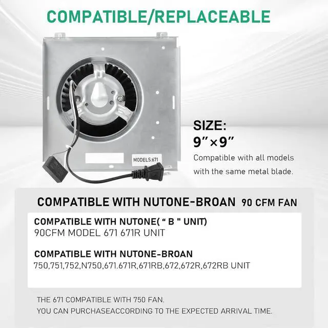 Compatible for Nutone 672R,672RB,671R,671RB,8663B,8663RP B,8663NLP , 8664RP B, 8664B, 8814R, 6334, 8973DG, 6445, VL3668, 8663RF, 8663RFT 8663RLG,8663RMA,8663RMBR 8663RMSA.Compatible for Broan 750,751,752,N750,750-R02 751-R02 Unit. Based on confidence in quality, the manufacturer offers a 3-year manufacturer defect replacement service for all fans sold.