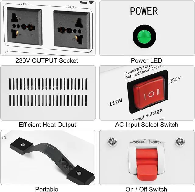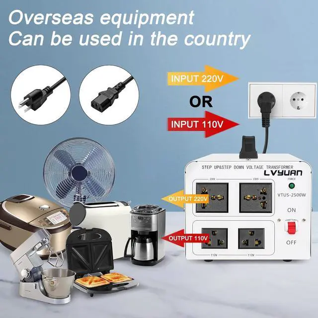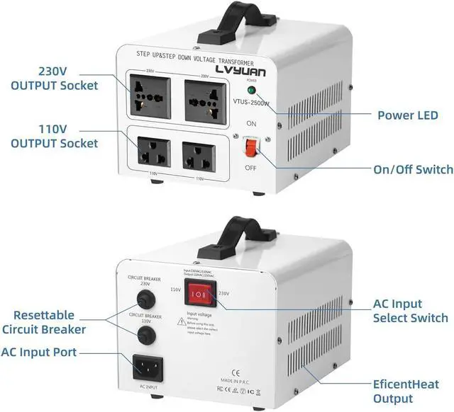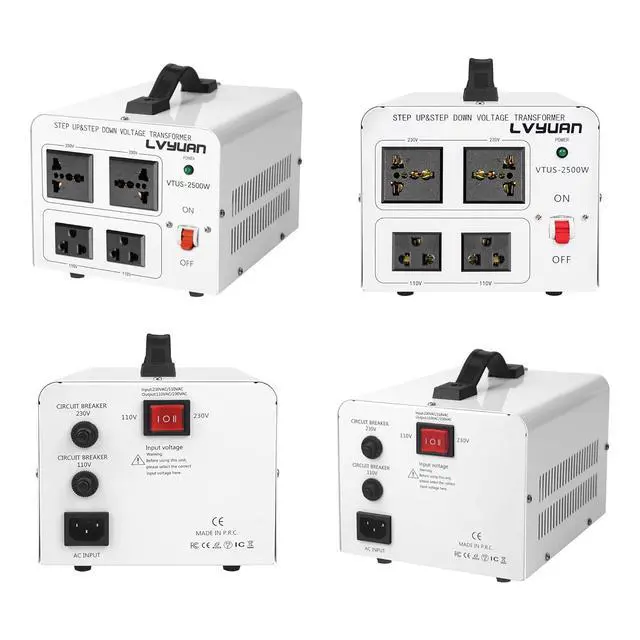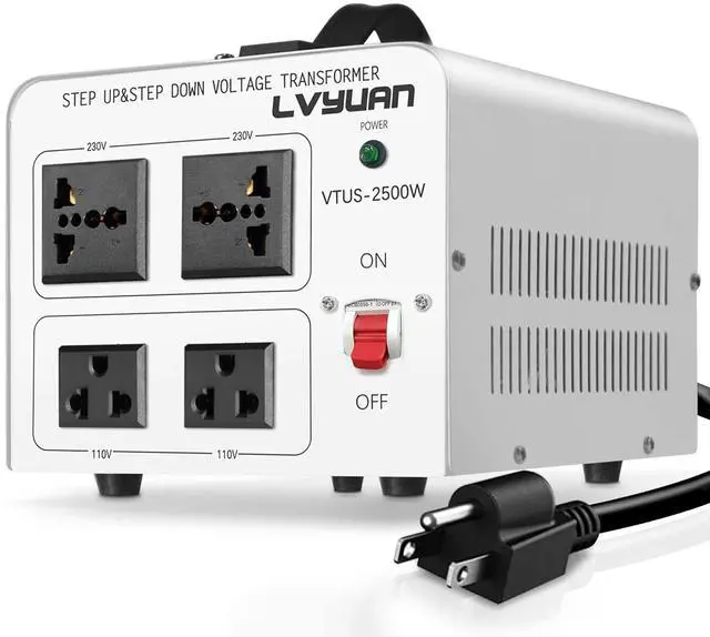 Enjoy worldwide compatibilityWith 2 AC outputs, including 2 US standard sockets and 2 universal sockets, this transformer can auto-convert 110-120V to 220-240V or 220-240V to 110-120V (except for the Big South African plug). The transformer can be used in countries which voltage are 90V125V or 180V250V such as US, EU, UK, JP and more