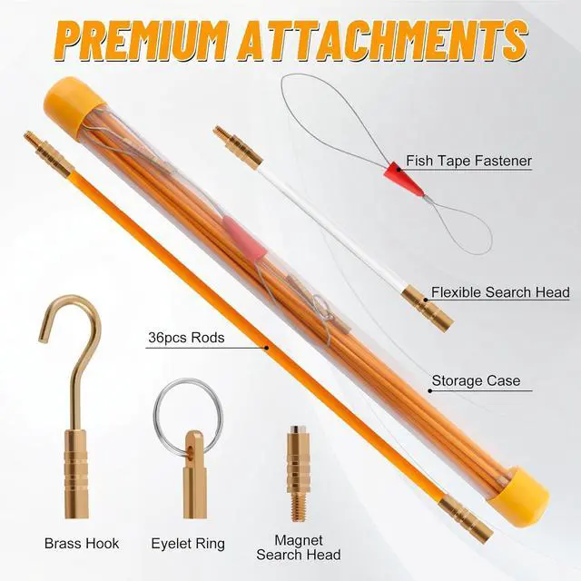 CONVENIENT STORAGE: Our electric fish tape tools includes 36pcs fiberglass rods, brass hook, magnet search head, flexible search head, eyelet ring, fish tape fastener and a storage case. Different accessories are packed in one transparent plastic tube case, easy to store and carry