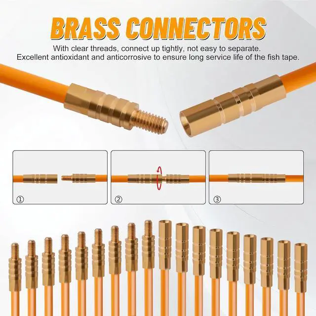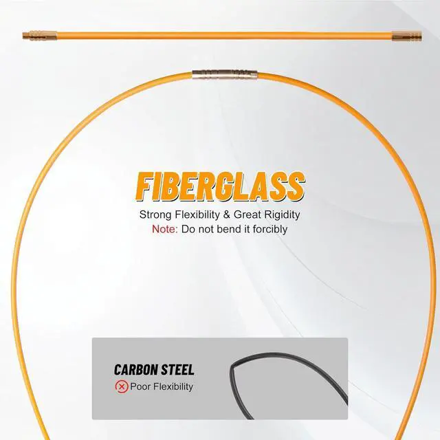 MATERIAL: Our fish tape kit is made of high quality fiberglass, better than plated carbon steel. This wire snake has strong flexibility, rigidity and great insulation, and will not break when folded. Low friction design allows the cable fishing tools to easily glide through the conduit without binding at turns, joints or couplings. Note: Do not bend it forcibly