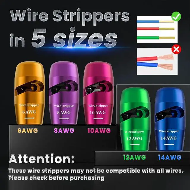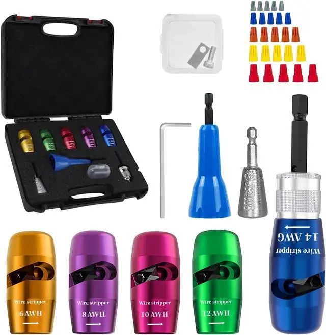 [Comprehensive Electricians Tool Set] This all-in-one set includes 5 wire strippers (14-12-10-8-6AWG), 2 wire twisters, 25 wire nuts, and an additional replacement blade for extended usability. With a 1/4" hexagonal shank design, it works seamlessly with most electric drills. From stripping to twisting and connecting, this wire stripper kit meets all your electrical wiring needs, saving time and eliminating the need for additional purchases.