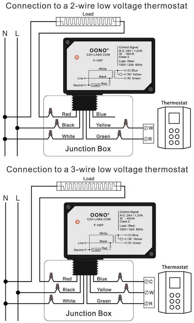 The F-1057 Electric Heating Relay is designed to control a AC 120V line voltage resistive load from a low voltage thermostat. The F-1057 relay has a built-in 24 V transformer and is compatible with 3-wire (R, C, W) thermostats as well as 2-wire (R, W) mechanical and battery-operated thermostats.