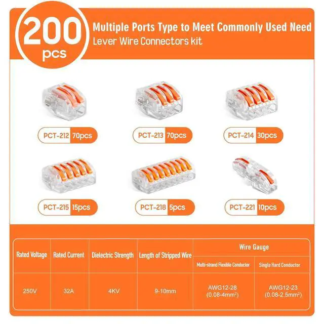 Versatile Connectors: Multiple port types are designed to meet your common needs for joining 2, 3, 4, 5, or 8 conductors. These lever wire connectors can be used flexibly in narrow spaces, making them ideal for a wide range of electrical applications