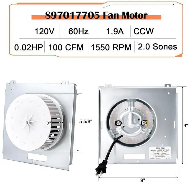 Parameter of Nutone S97017705 - 5 5/8'' Dia x 2'' H Blower Wheel, 9" L x 9" W Mounting Bracket, 3 7/16'' Dia x 2 3/16'' H Motor, 2-Prong Plug, Shaft Rotation: CCW, Voltage: 120V, 1.9A, 60 Hz, 100 CFM, 1550RPM, 0.02HP, Thermally Protected. For Use with Model 8663RP "A" Housing Only.