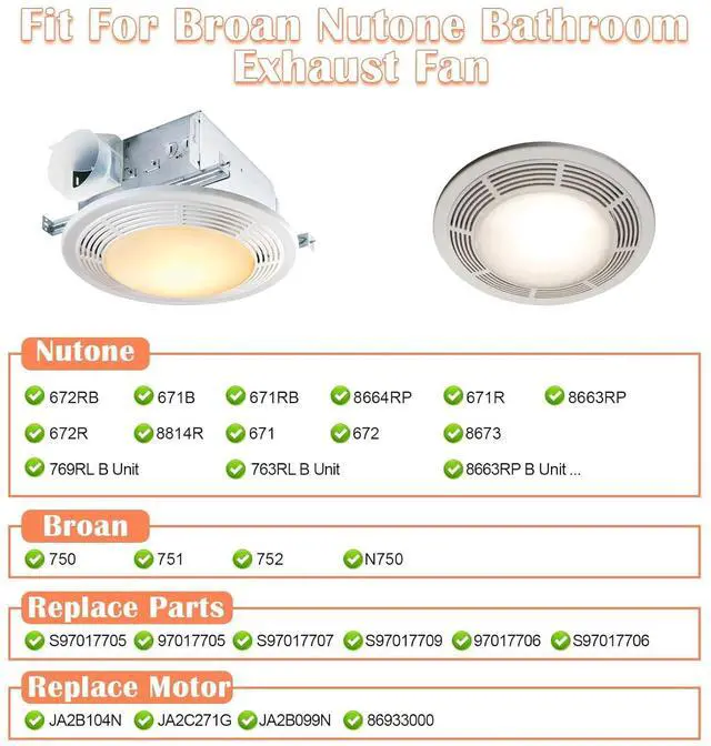 Fit For Broan Nutone Bathroom Exhaust Fan Models - Nutone 672RB, 671B, 671RB, 8664RP, 671R, 8663RP, 672R, 8814R, 671, 672, 8673, 769RL B Unit, 763RL B Unit, 8663RP B Unit, 8663RF, 8663RFT, 8663RLG, 8663RMBR, 8673RP, VL3668RP, 8663RMAB, 8663RMS, 8663RMSA, VL3668RLG, VL3668RMAB, VL3668RMBR, VL3668RMSA, 666, 6445, VL3668, 371, 763 Rb. Broan 750, 751, 752, N750. Replaces Part: S97017705, 97017705, S97017709, 97017706, S97017706, S97017707, S-97017705, VL-3668P, 71731997, 100599, 7173-1997, S-97017706, S97017704. Replaces Motor JA2B104N, JA2C271G, JA2B099N, 86933000.