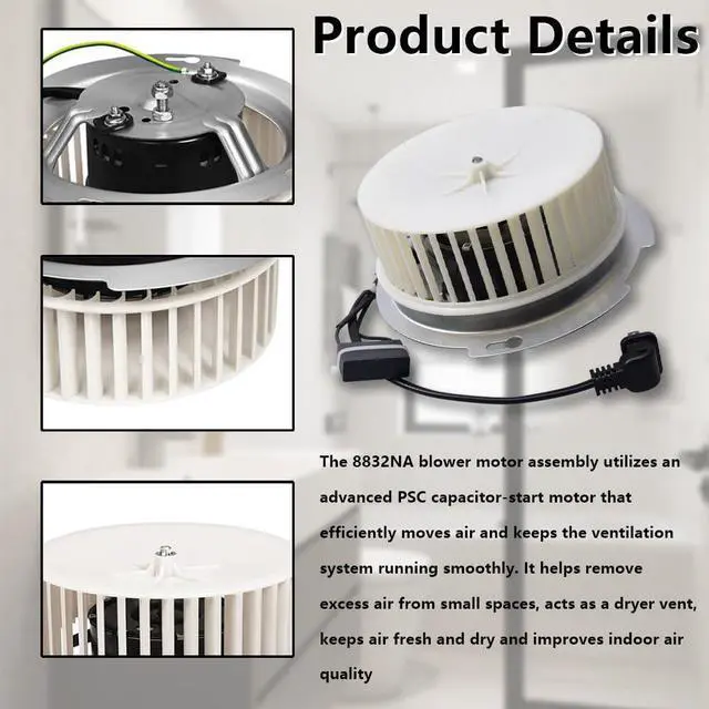 The 8832NA blower motor assembly features an advanced PSC capacitor-start motor that efficiently pushes air and keeps the ventilation system running smoothly. It helps exhaust excess air from small spaces, acts as a dryer vent, keeps air fresh and dry and improves indoor air quality.