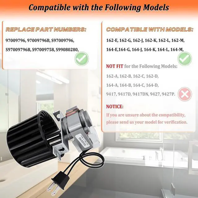 Notice:Please make sure your model number is listed below before purchasingReplaces Part Numbers:97009796, 97009796B, S97009796, S97009796B, S97009758, S99080280.Fits Models:162-E, 162-G, 162-J, 162-K, 162-L, 162-M, 164-E,164-G, 164-J, 164-K, 164-L, 164-M.Tips:If you are not sure whether this replacement part is correct, please feel free to let us know through our storefront or ask in Customer Q & A section.Disclaimer:All the mentioned machine brands & models are merely used to illustrate compatibility of the replacement part. S97009796 Bath Fan Motor blower assembly Only Compatible with the Following Models: