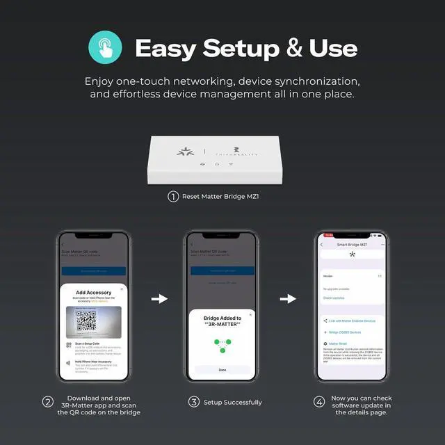 Zigbee to Matter Connectivity: The Smart Bridge MZ1 effectively links THIRDREALITY Zigbee end devices to the Matter protocol, enhancing their functionality in the broader smart home ecosystem. Note: Specifically operates on a 2.4 GHz Wi-Fi network.
