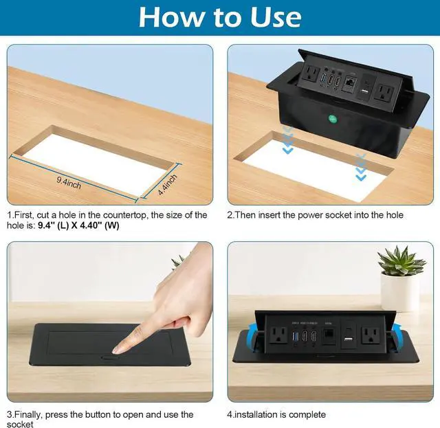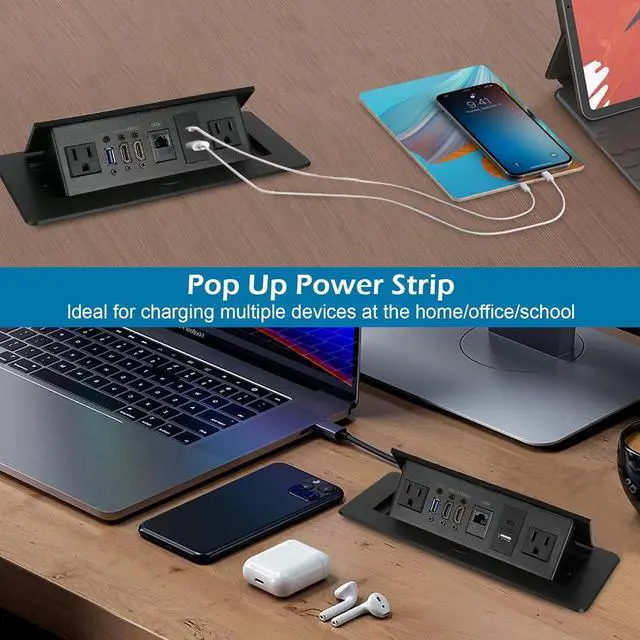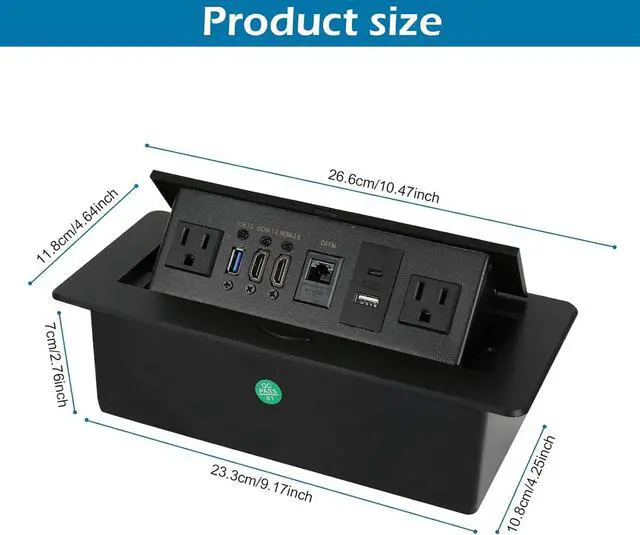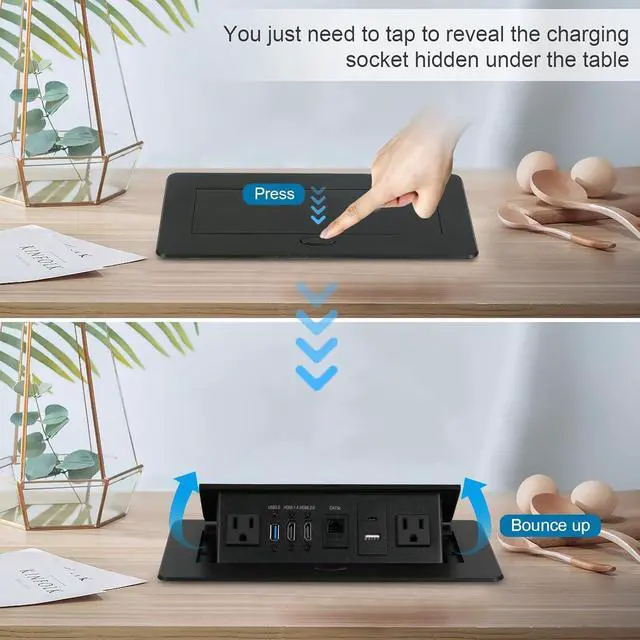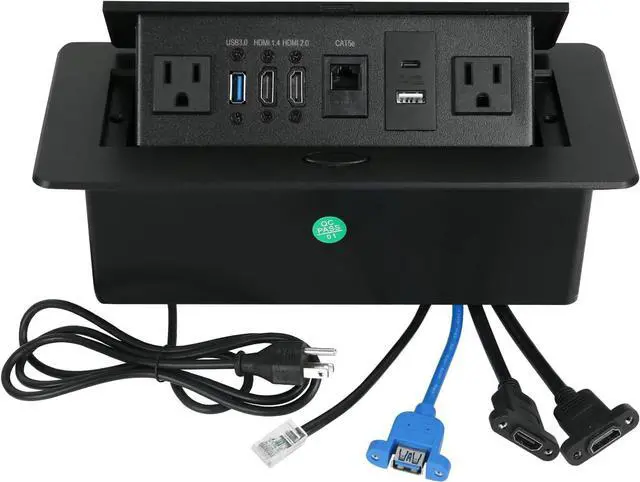 Buy this product, you can get 1 piece pop-up desktop outlet, built-in 2 AC outlets, 1 USB A and 1 USB C ports, 1 USB3.0,1 HDMI1.4,1 HDMI2.0 and 1 * LAN, 1.8M power cord, enough configuration to meet the charging needs of your daily devices