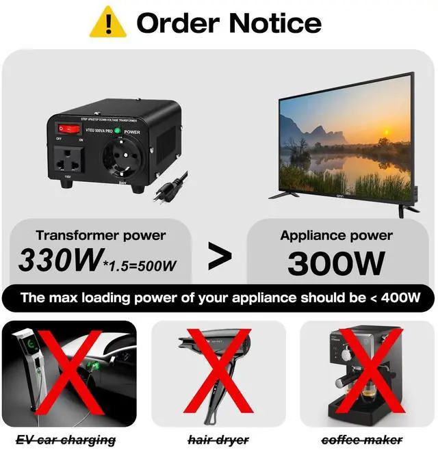 WarningThe 500W transformer cannot support high-wattage appliances (e.g., coffee makers, hair dryers, rice cookers, microwaves, AC units, or curling irons). For these devices, use our 3000W transformer.