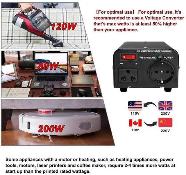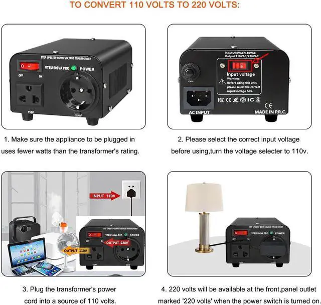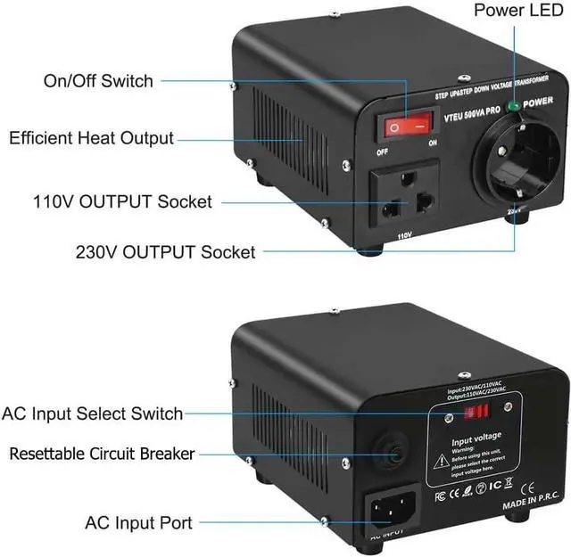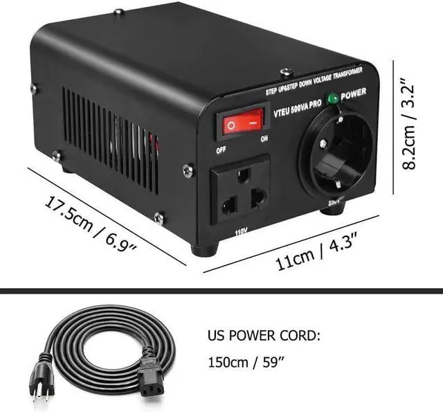 500W Step Up/Down TransformerAs a voltafe Transformer from 110-120V to 220-240V OR from 220-240 volts to 110-120 volts for your applications in the U.S. and Europe.NOTEThe transformer is equipped with an US power cord, if used in other 220V-240V country you MUST need a plug adapter or local power cord.