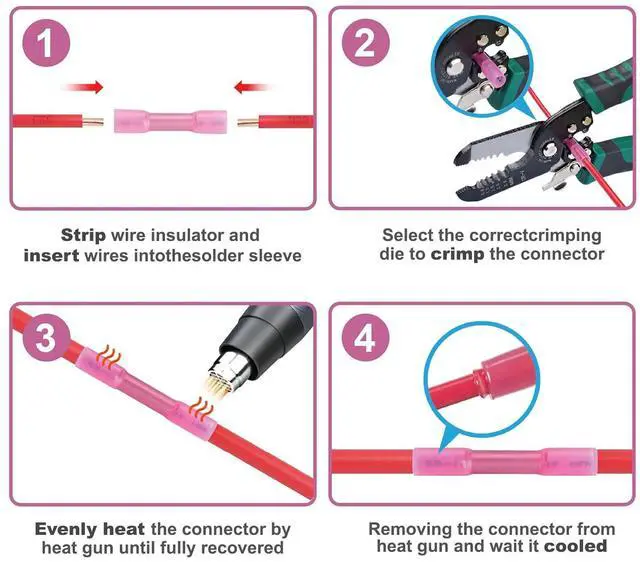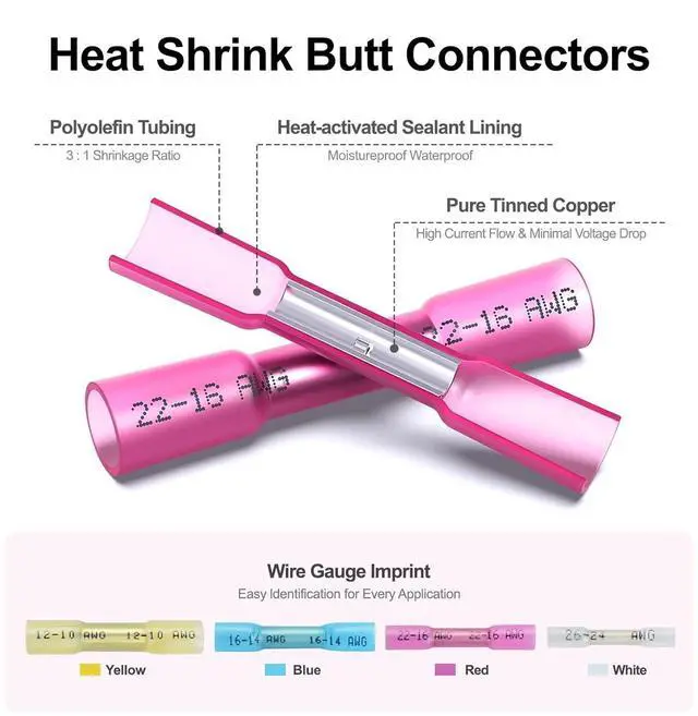 Safe, convenient and durable waterproof heat shrinkable wire connector DurabilityPure copper tinned :Each butt terminal is tinned with high-quality red copper to ensure good conductivity and durability EASY TO USE Strip wire insulation with a wire crimper, crimp the connector barrel, then heat with a heat gun or small torch. Shrinkage ratio: 3:1