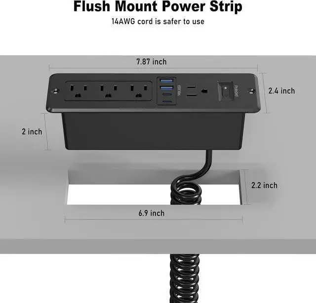 PD 65W USB C Recessed Power Strip 14AWG High-Quality Cables Ensures Stable & Safer Power Output Classic Surface Mount Recessed Outlet 65W USB C Power Strip Step 1 Step 2 Step 3