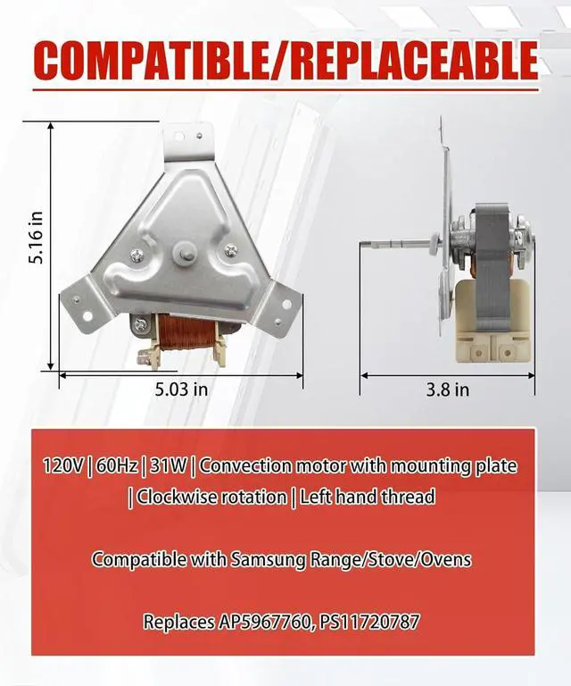 scope of applicationreplacement motor compatible with Samsung OEM DG96-00110E cooktop/stove/ovenReplaces AP5967760, PS11720787 etc.