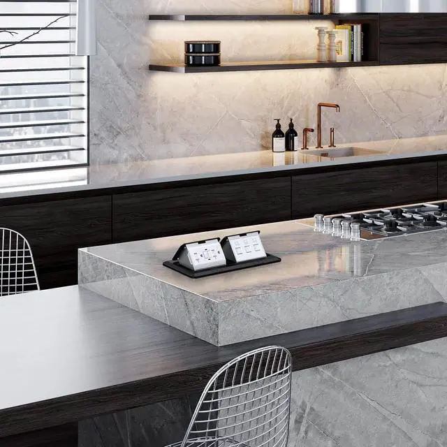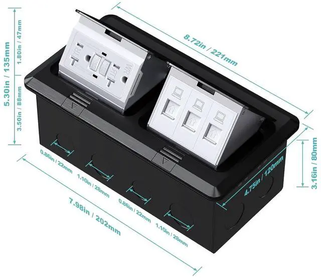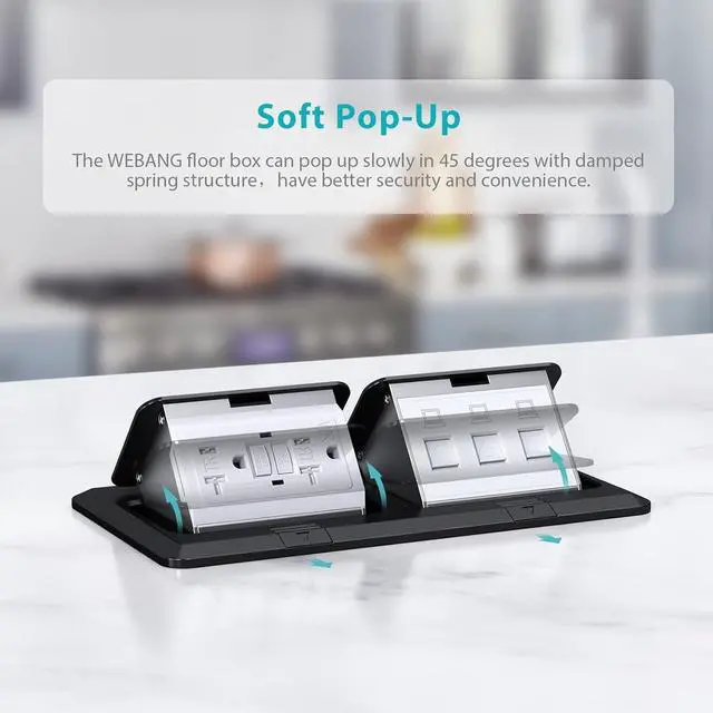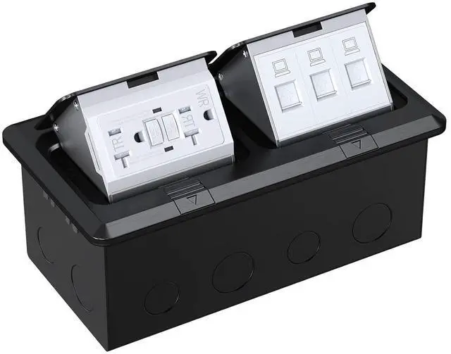 The Dual Pop-up Floor Box Kit includes a hard material duplex pop-up floor box, 2*20A tamper resistant receptacle, 3*RJ45CAT6 Applications: Perfect for hard wood, carpet, and tile flooring applications, as well as granite / marble kitchen counter tops.