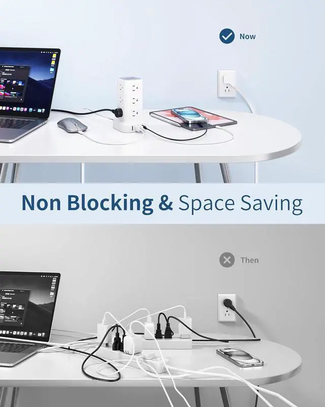 Space-Saving Charging Towers- Vertical design saves your desk place; Simply plug this power bar for multiple devices to organize your desktop, nightstand, dorm room in any place without taking up desk space, giving you a neat and tidy place; Add 4 anti-slip pads on the bottom to effectively avoid shaking and slipping.