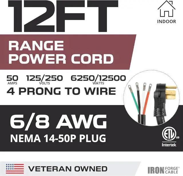 ETL CERTIFIED: The 50 amp long rv/range/stove extension cord is ETL certified and has a 4 prong to wire range design with a 6/8 gauge, 12 foot, NEMA 14-50 plug, STW rated, 125V/250V, 12500 Watt