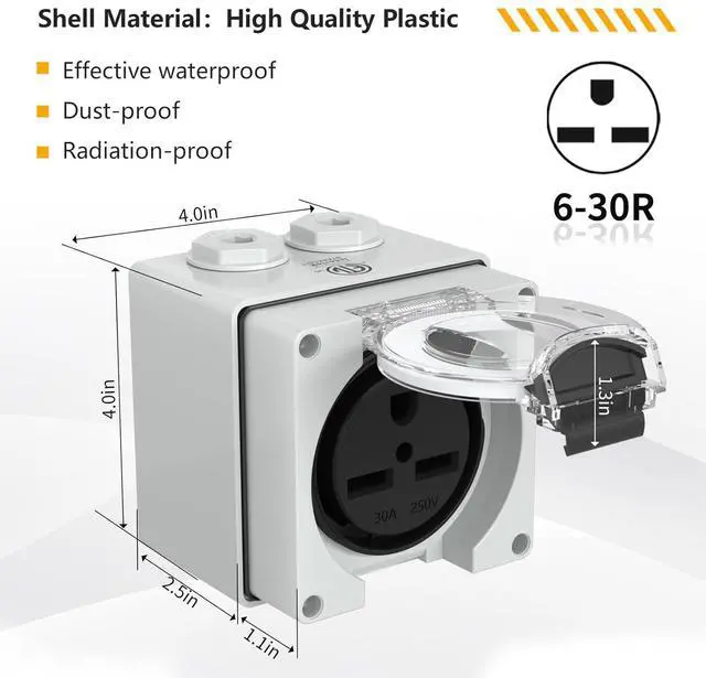 Specifications: NEMA 6-30 Receptacle, one power outlet with protective box.