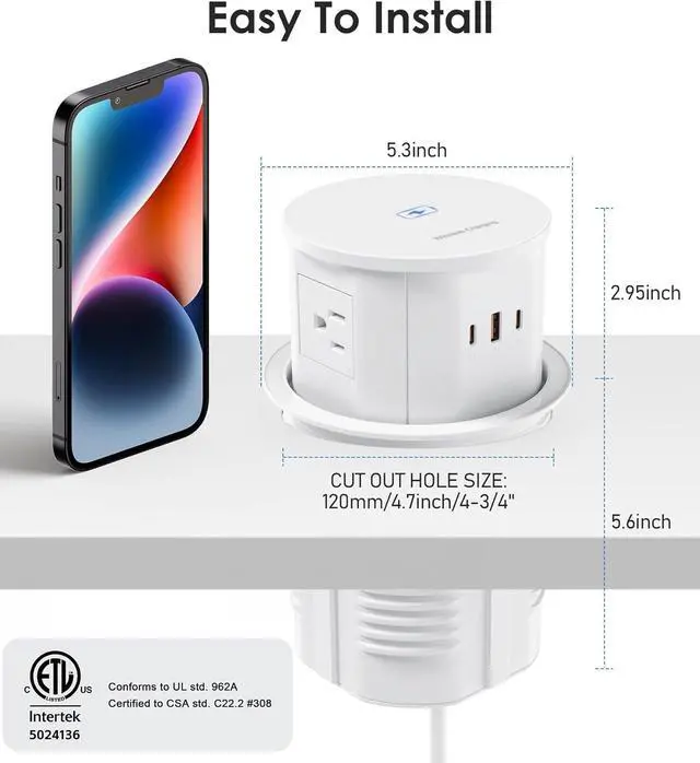 Easy To Install: Cut a 4.75"(120mm) hole, remove the ring and slide the countertop pop up outlet body from top, tighten up the ring from bottom. Make sure to have a 6 inch space under the table.
