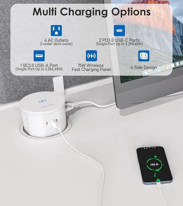 Child-Safe Design: The pull up and down spring loaded mechanism is hidden under the desk, ensuring safety for your kids. When the outlet is flat, you can also use the 15W wireless panel to charge your phone or bluetooth earphone. Get rid of messy cables.