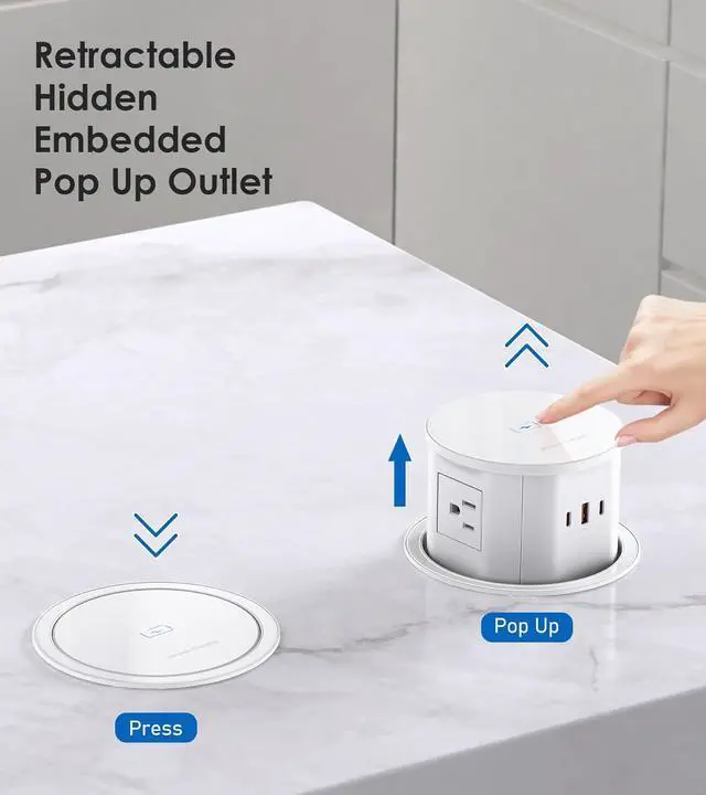 Effortless: Retractable & hidden design with a spring-loaded mechanism for easy access to power. Simply press the panel, the pop up countertop outlet will automatically rise up. Power up your devices right away.