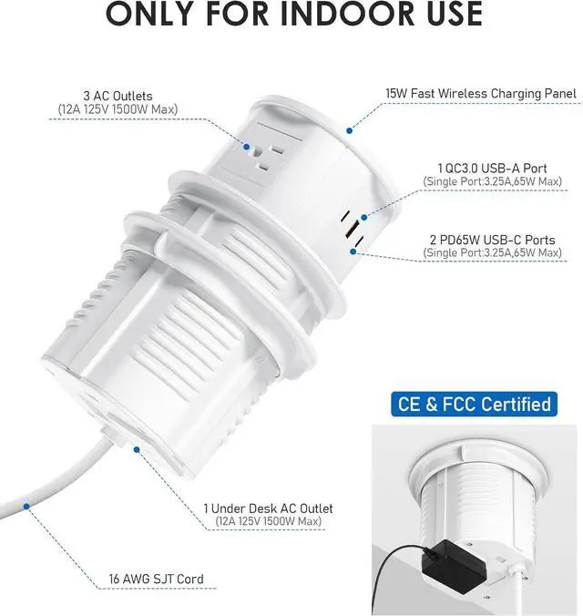 65W USB-C Quick Charging: The pop up socket is equipped with 4 grounded 3 prong AC outlets, 2 USB-C, 1 USB-A and 1 15W Wireless Charger, 6FT 16AWG extension cord. AC rating: 100-240V/1500W/12A, USB-C single port output: 3.25A,65W Max.
