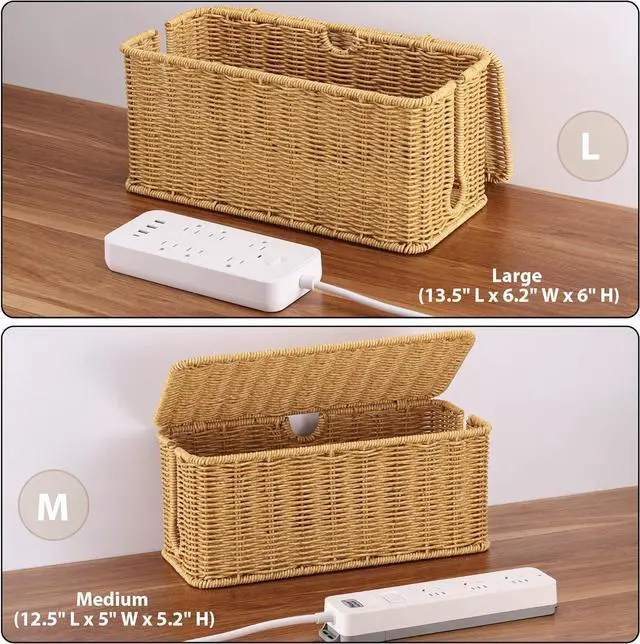 Large Capacity & Practical Design: This cable box provides ample space and comes in two sizes: Large (13.7" L x 6.5" W x 6.2" H) and Medium (12.5" L x 5.2" W x 5.5" H), accommodating most power strips and surge protectors. Please confirm the size of your power strip before ordering to ensure the right fit
